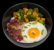 Steamed rice,red onion, edamame, tofu,broccoli, free-range egg, sesame seeds mix, spring onion, katsuobushi and a sauce of choice
