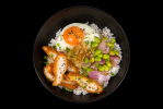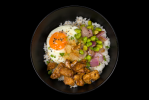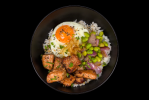 Steamed rice,red onion, edamame, marinated chicken,free-range egg, sesame seeds mix, spring onion, katsuobushi and a sauce of choice