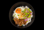 Steamed rice,red onion, edamame, slow cooked pulled beef,free-range egg, sesame seeds mix, spring onion, katsuobushi and a sauce of choice