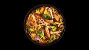 Udon spaghetti, beef, peppers, Sichuan sauce and sesame mix with fresh vegetables and egg