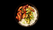 Мариновано пилешко, мариновани кисели краставички с тогараши пипер, пресен лук и нашия Терияки сос поднесено с топка задушен ориз и сусамен микс