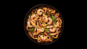 Удон спагети, скариди, шийтаке гъби, пресен лук и якисоба сос поръсено със сусамен микс