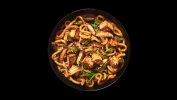 Удон спагети, мариновано пиле, шийтаке гъби, пресен лук и якисоба сос поръсено със сусамен микс