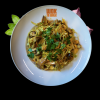 Rice spaghetti, shrimp, edamame, Bangkok sauce, fresh vegetables and egg sprinkled with nori seaweed topping